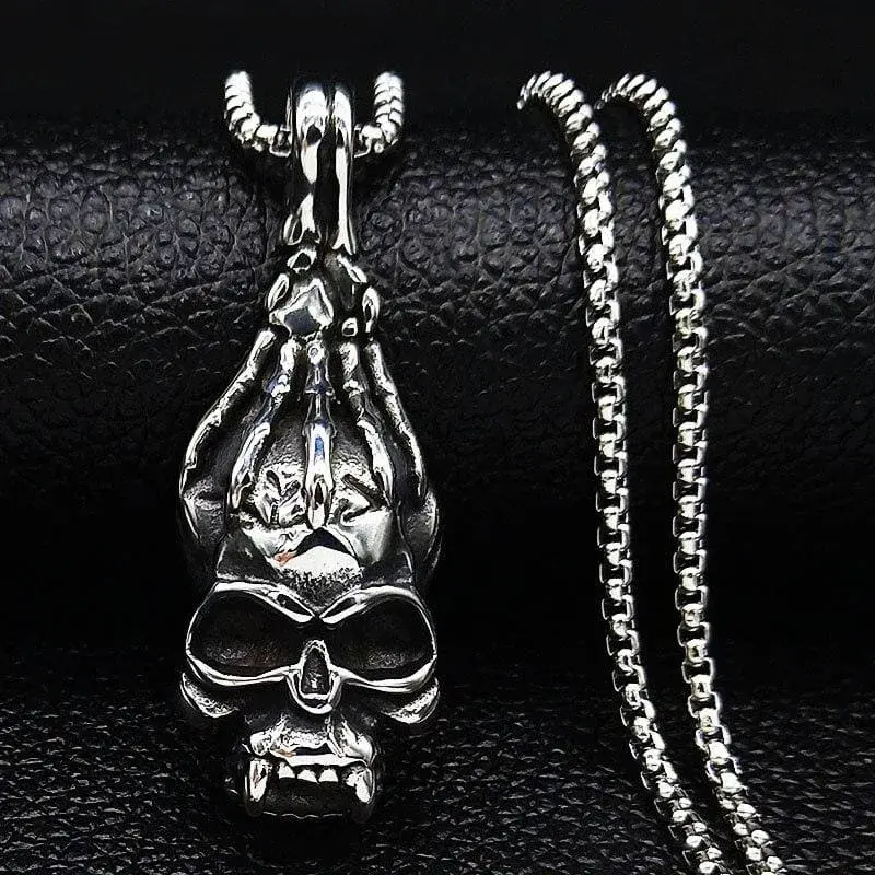 • Einzigartiges Design: Das detaillierte Totenkopf-Medaillon symbolisiert die Hand des Todes, die einen menschlichen Schädel greift – ein markantes Statement für einen rebellischen Look.