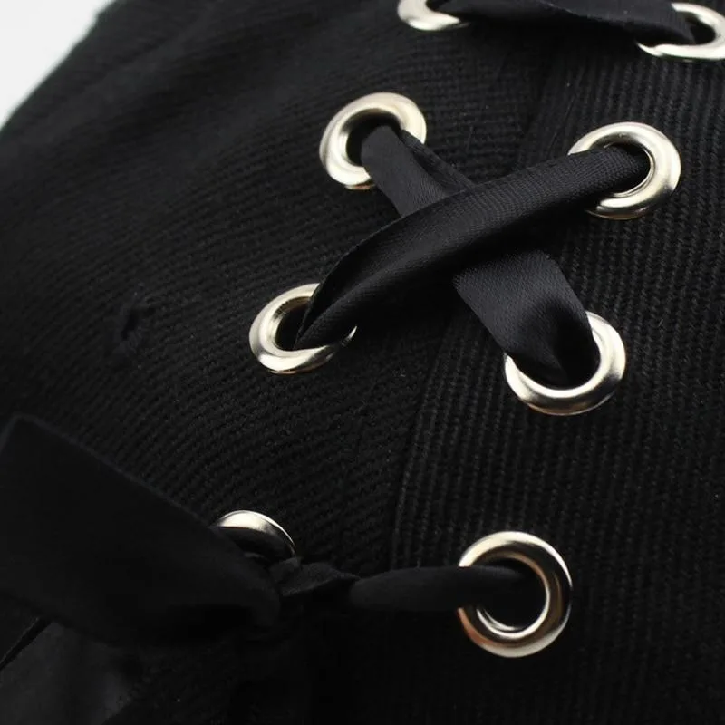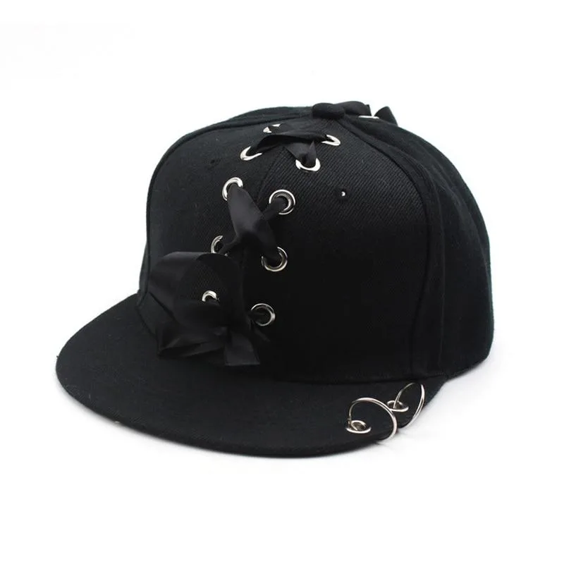 - Gothic Stil: Schnürdetails und Metallringe verleihen der Kappe ihre auffällige, düstere Ästhetik.