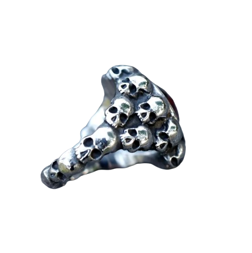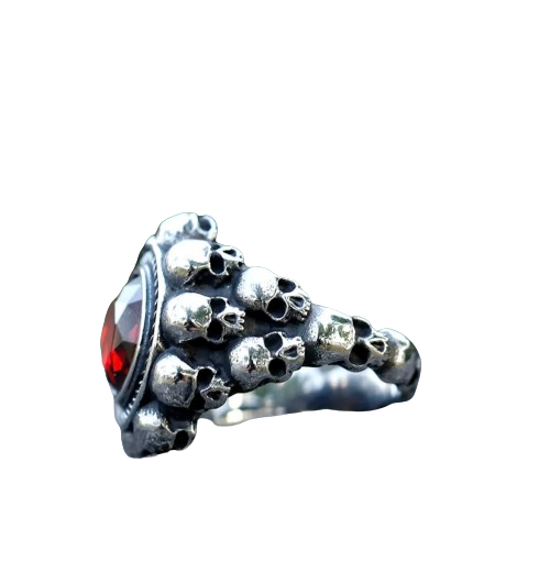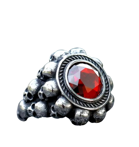 - Einzigartiges Design: Verziert mit detaillierten Totenkopfmotiven und einem fesselnden roten Stein, der für ein düsteres und faszinierendes Erscheinungsbild sorgt.