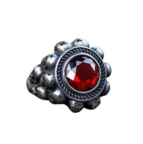 - Design: Totenkopfdetails und glänzender roter Stein als zentraler Fokus