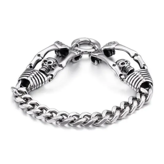 - Stilvolles Design: Geschmückt mit zwei filigran ausgearbeiteten Skelettmotiven, die über eine Panzergliederkette verbunden sind, ist dieses Schmuckstück ein echtes Highlight für Liebhaber des Gothic-Stils.