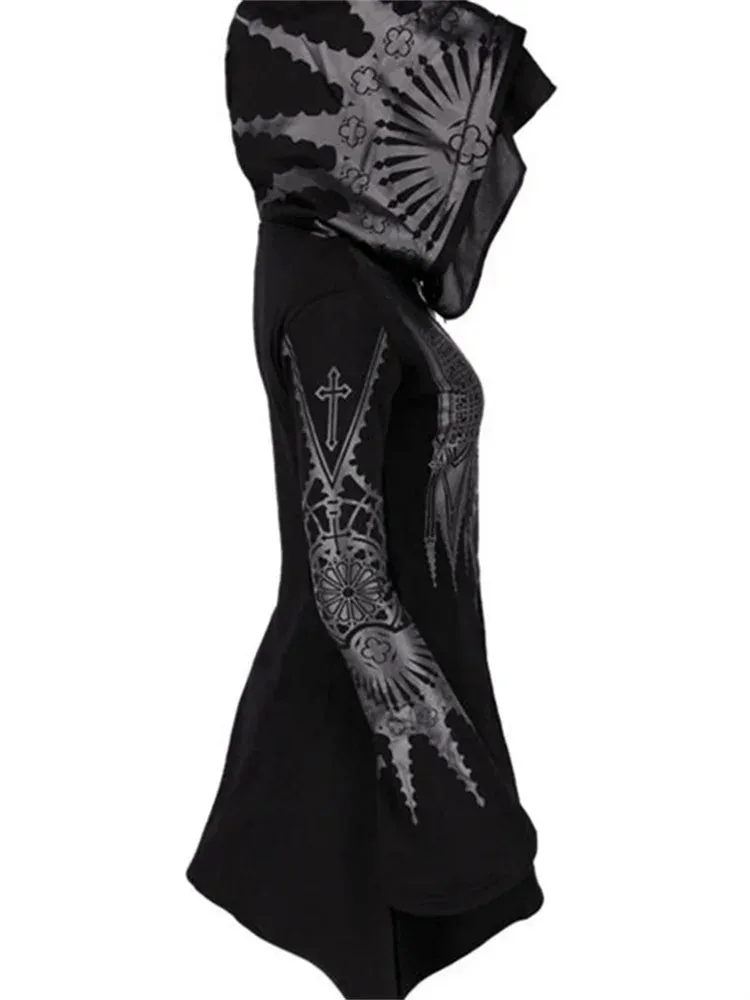 - Design: Integrierte, gefütterte Kapuze mit Schleier und synthetischem Druck für eine rebellische Ästhetik