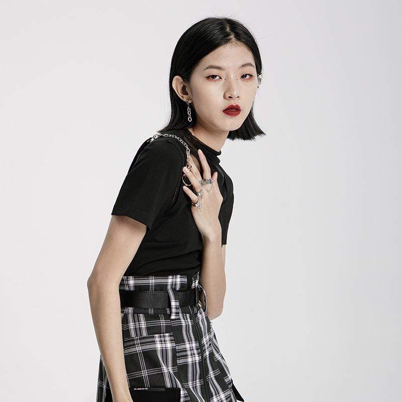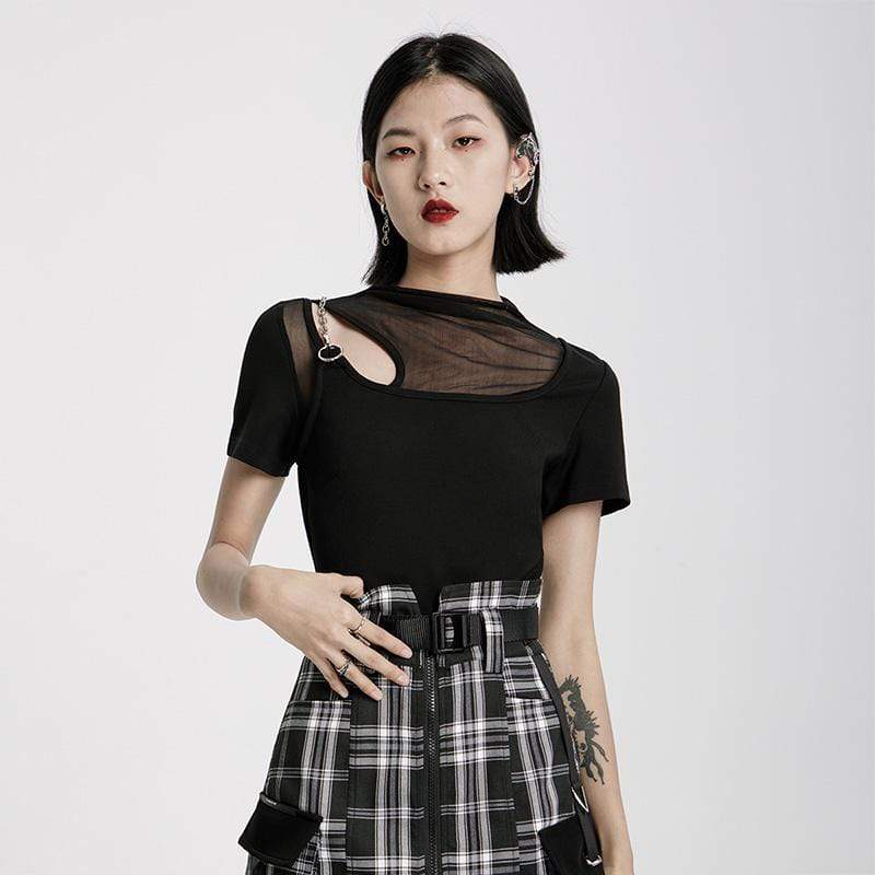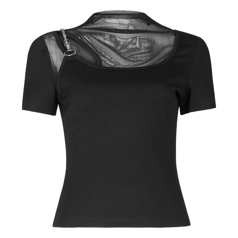 Entdecken Sie unser Kurzärmeliges Gothic-T-Shirt mit Ausschnitt für Damen, ein Muss für alle Gothic-Fashion-Liebhaberinnen. Dieses außergewöhnliche Oberteil vereint Stil und Komfort mit einem Hauch von Rebellion. Hergestellt aus hochwertiger Baumwolle und Mesh, bringt es sowohl Strapazierfähigkeit als auch eine leichte, atmungsaktive Textur mit sich. Perfekt kombinierbar für Alltag und besondere Anlässe – ein Gothic-T-Shirt, das überall auffällt.