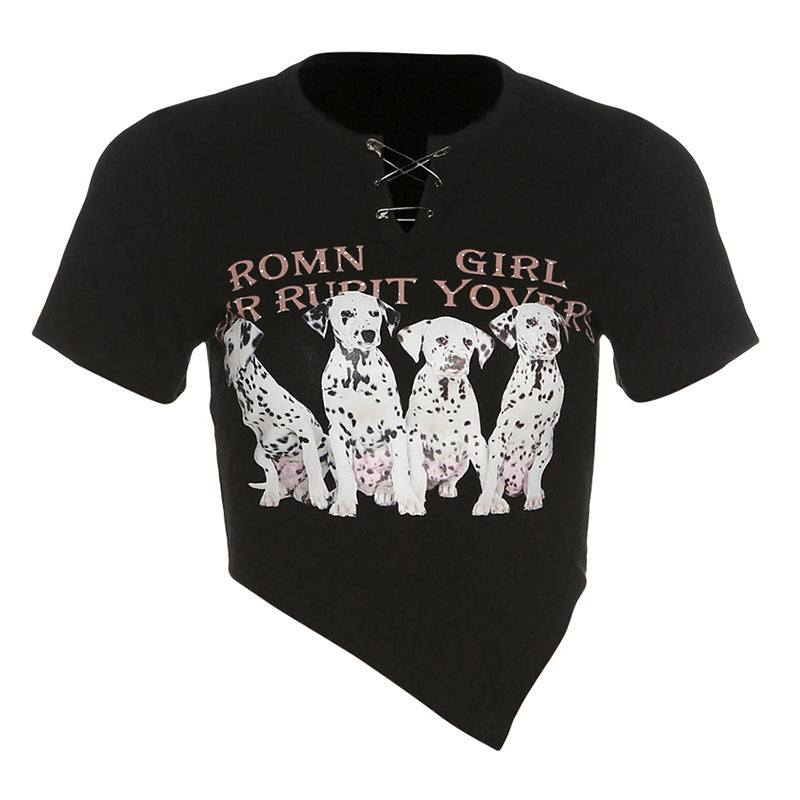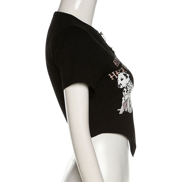 Entdecke das kurzärmlige Crop-Top im Grunge-Stil für Damen mit einem coolen Spotty Dog-Motiv. Perfekt für einen lässigen und trendigen Look!