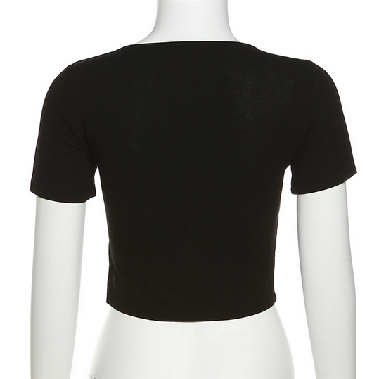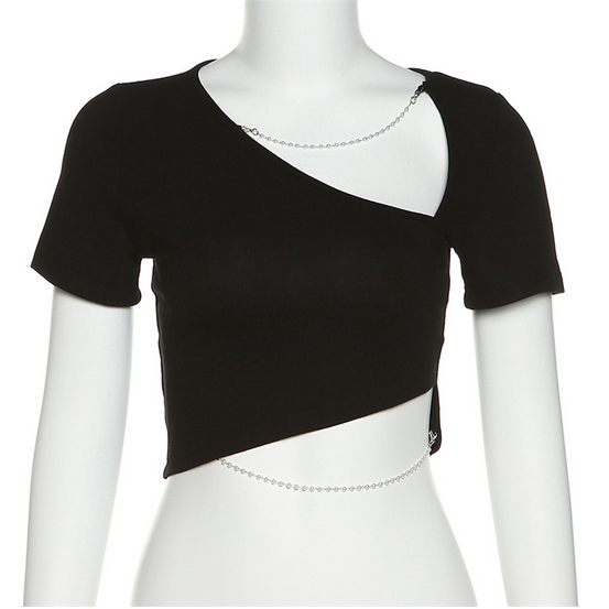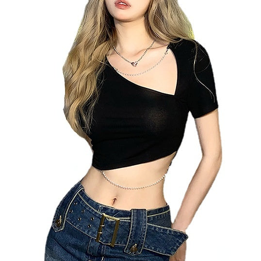 Kurzärmliges Punk-Crop-Top für Damen mit V-Ausschnitt und Perlenkette
