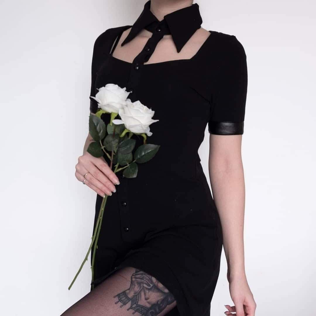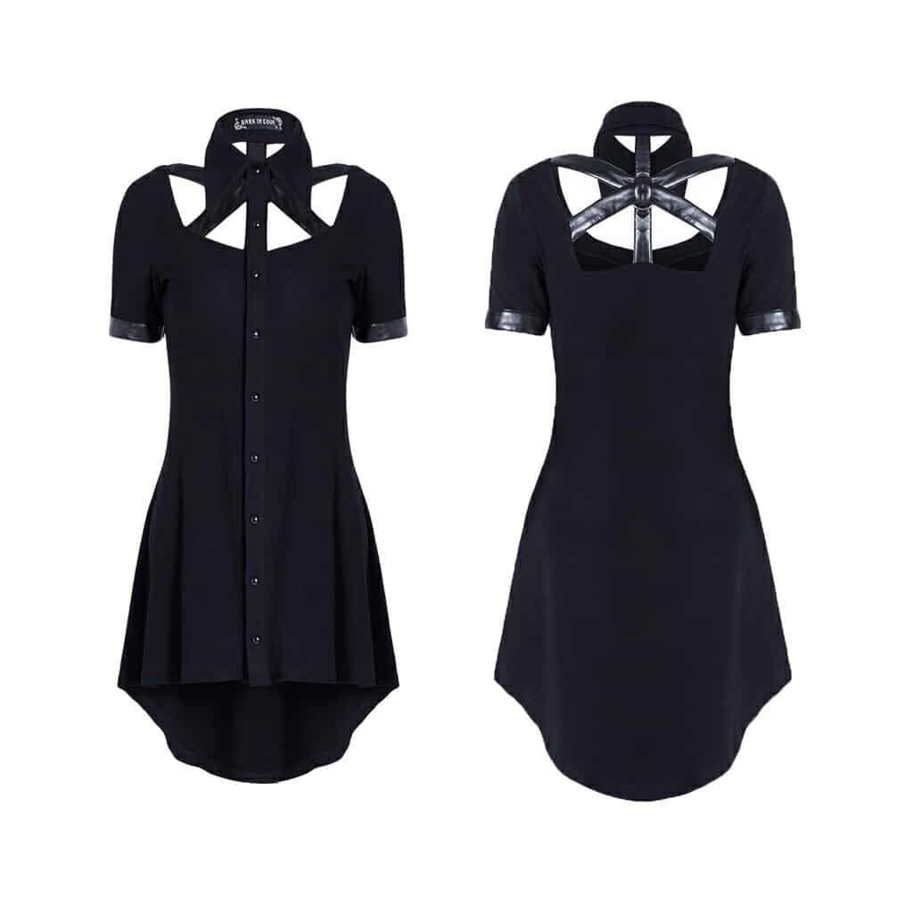 Entdecken Sie das kurze schwarze Gothic-Kleid aus Kunstleder für Damen mit detaillierten Details, ein außergewöhnliches Modehighlight für alle Fans des Gothic-Stils. Dieses Kleid verbindet Eleganz und eine rebellische Note durch seine Kombination aus Baumwolle und Kunstleder. Perfekt geeignet für Alltag oder Abendveranstaltungen, verleiht es Ihnen einen mystischen und gleichzeitig stylischen Auftritt.