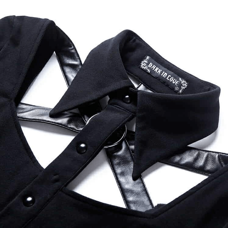 - Design: Tiefer Ausschnitt mit einem auffälligen Kragen und Lederriemen-Details
