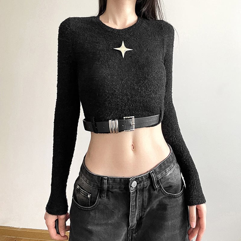 Langärmliges Crop-Top im Grunge-Stil für Damen mit Rundhalsausschnitt und Gürtel