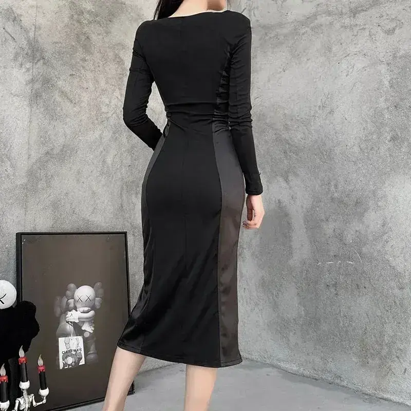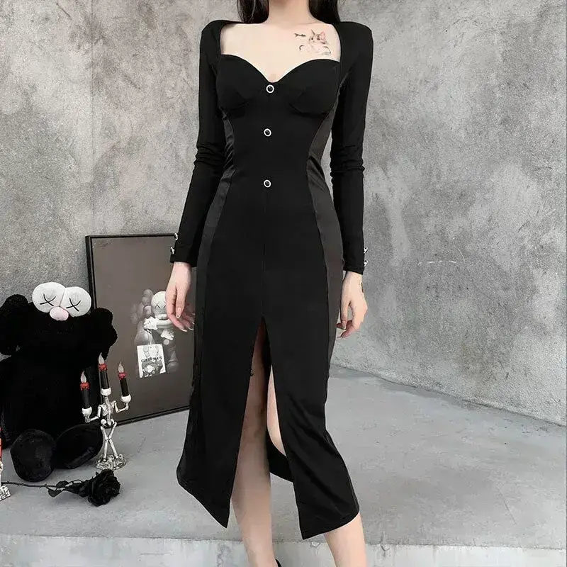 Elegantes langes Gothic-Kleid für Damen mit asymmetrischem Schnitt, betont Brust, Taille und Beine. Perfekt für einen schlanken und stilvollen Look!
