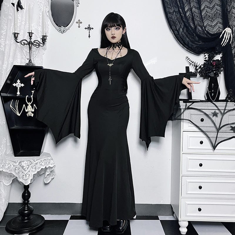 Bereichern Sie Ihre Gothic-Garderobe mit dem Langes Gothic-Kleid im Meerjungfrau-Stil mit Fledermausärmeln für Damen, einem Kleid, das Eleganz und Dunkelheit perfekt kombiniert. Erleben Sie es selbst – ideal für einen einzigartigen und stilvollen Auftritt, der alle Blicke auf sich zieht!
