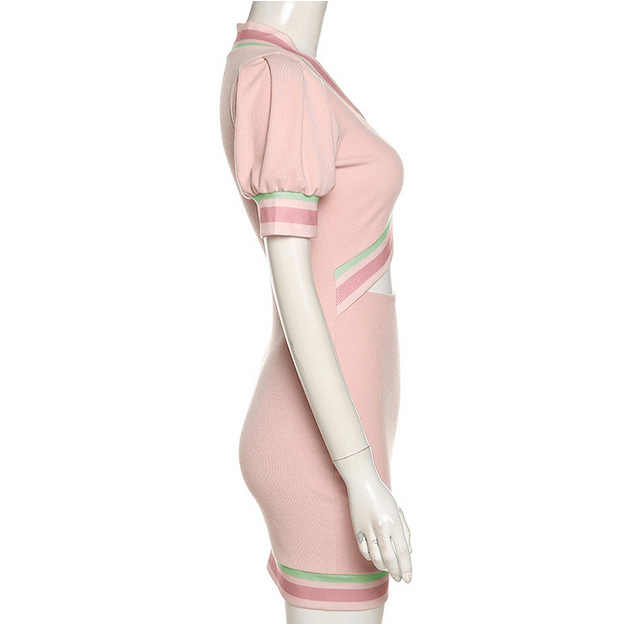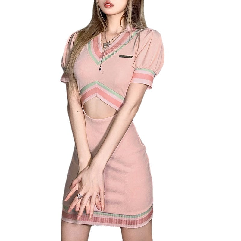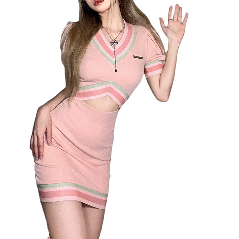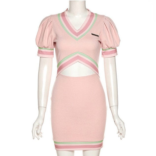 Pastellfarbenes Gothic-Strickkleid für Damen mit V-Ausschnitt und Ausschnitt in Rosa