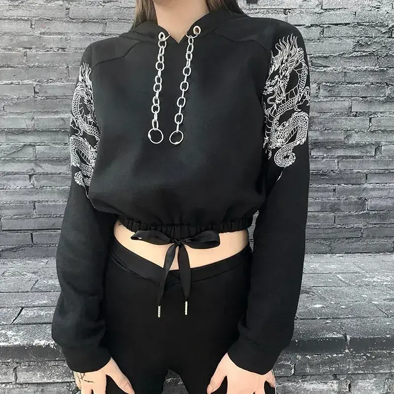 • Einzigartiges Design: Der Pullover verfügt über eine Kapuze mit trendigen Ketten sowie ein auffälliges Drachendruck-Muster, perfekt für den modernen Gothic-Rock-Stil.