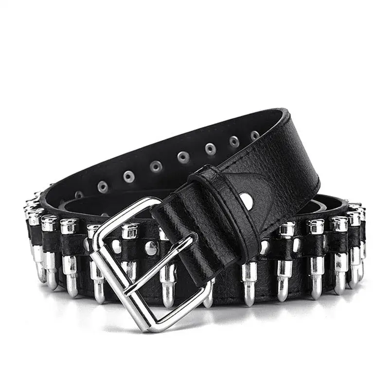 Punk Bullet Belt aus Leder mit Edelstahl-Schnalle. Stilvoller Patronengürtel für einen coolen, düsteren Look. 115 cm verstellbar, 7 Ösen, schwarze Farbe.