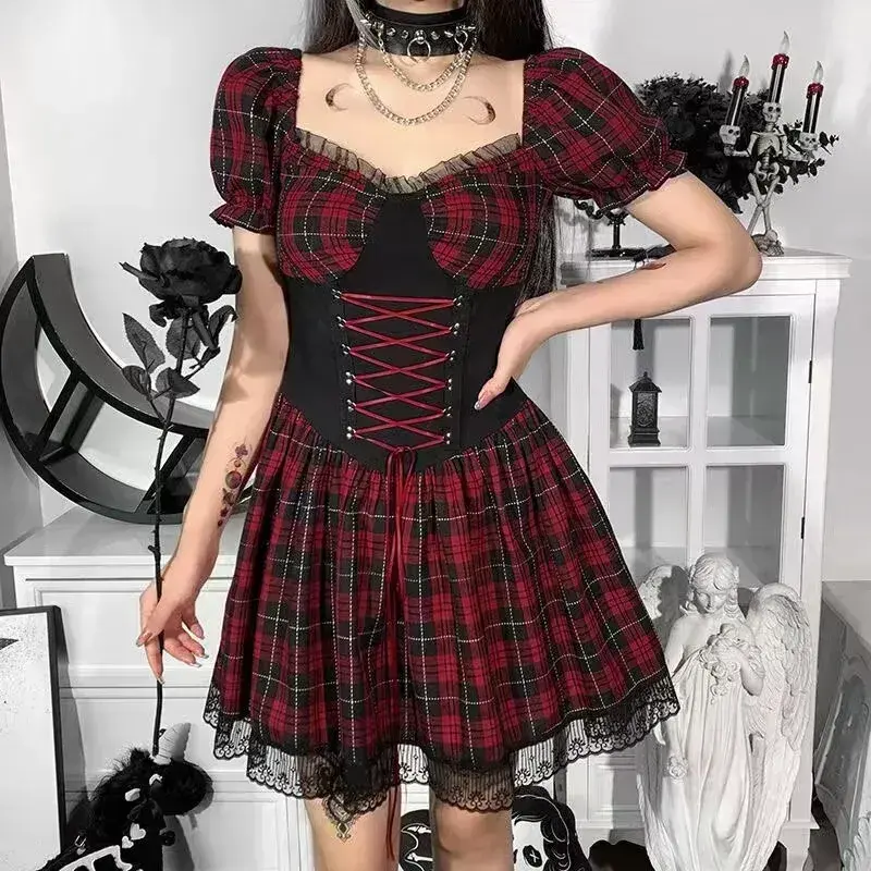 - Design: Rot-schwarzes Karomuster mit verzierten schwarzen Spitzen und einem eleganten Taillen-Korsett
