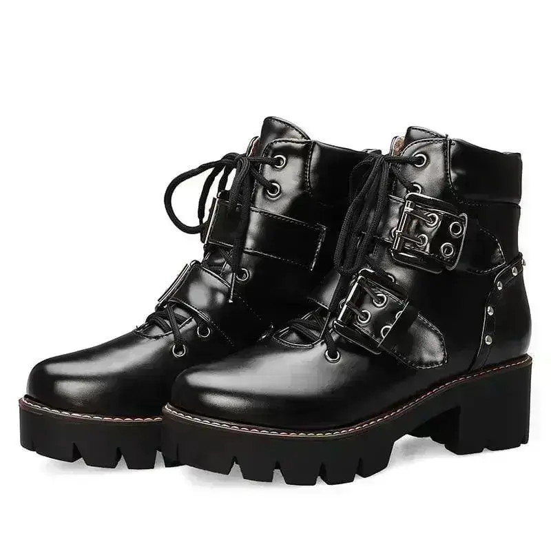 - Design: Schnürsenkel, Doppelriemen, silberne Nieten und Ösen, die bis über den Knöchel reichen