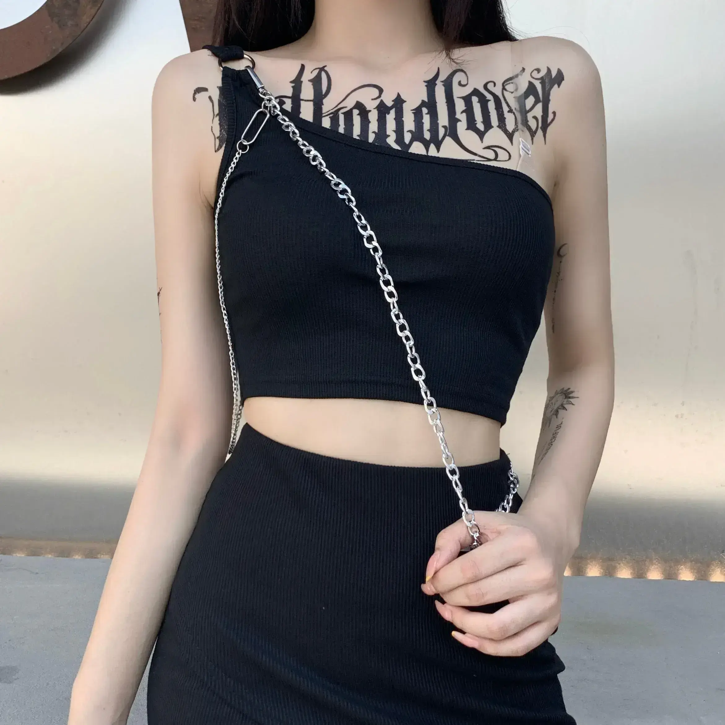 - Einzigartiges Design: Mit silbernen Ketten und Ringen verziert, schafft das Top einen kraftvollen Kontrast zur schwarzen Farbe, der Ihrem Stil eine kantige Note verleiht.