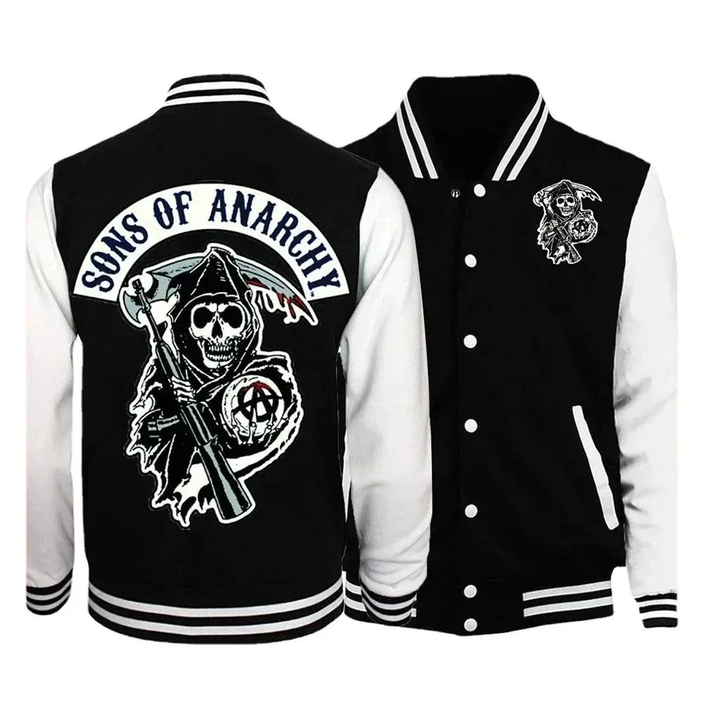Erleben Sie die Sons Of Anarchy Gothic Jacke, eine einzigartige Kombination aus dem rebellischen Stil der ikonischen Serie und dem Biker-Charisma, das Ihre Garderobe bereichert. Diese Baseballjacke unterstreicht Ihre Liebe zur Freiheit, Stärke und außergewöhnlichem Design. Perfekt für den Alltag oder einen besonderen Anlass, ist die Jacke ein Muss für jeden Gothic- und Biker-Liebhaber.