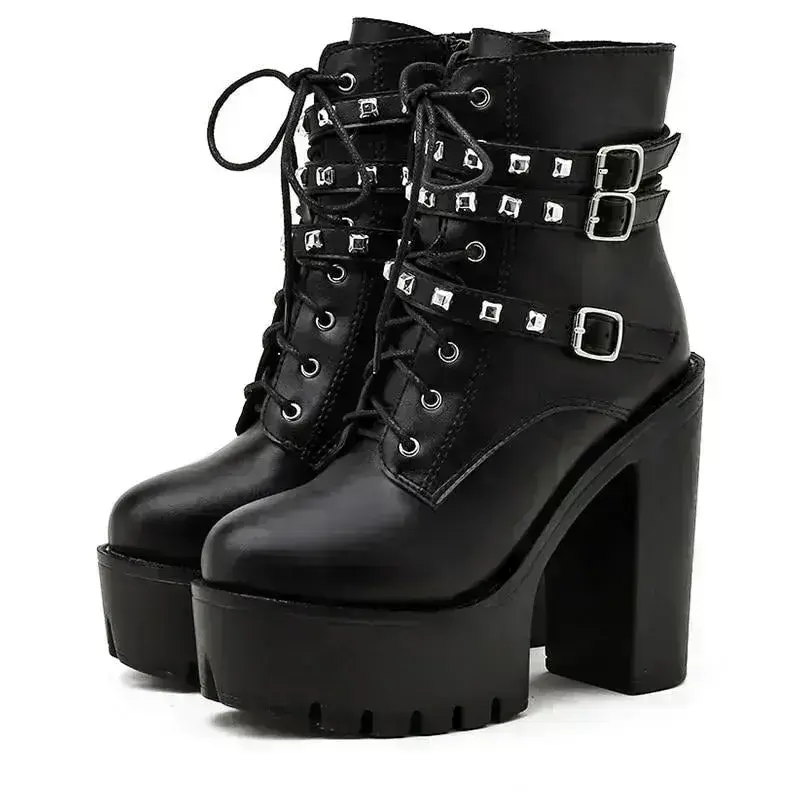 Gothic-Stiefeletten aus Leder mit 13 cm Blockabsatz und Plateau. Perfekt für jeden Look, vereinen Eleganz und Alltagstauglichkeit im zeitlosen Stil.