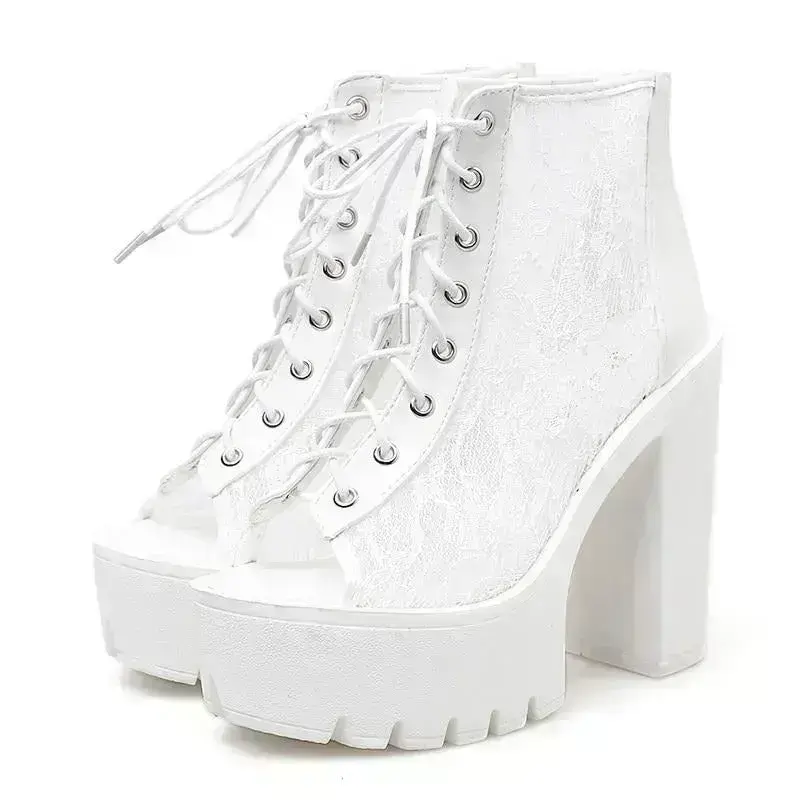 Weiße Gothic-Schuhe mit Spitze. Rockig, romantisch und sexy – perfekt für Frühling und Sommer. Ideal für Stadtbummel, Dates oder Hochzeiten.